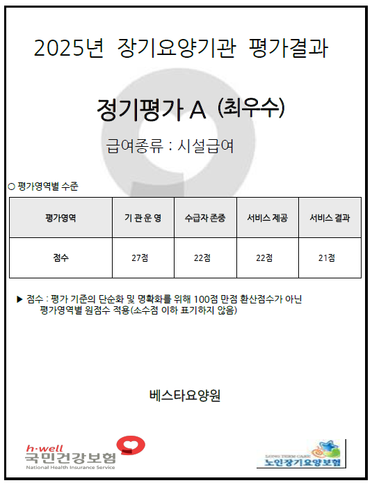 2025년 장기요양기관 정기평가 “최우수” 기관 선정 저희 베스타요양원은 항상 어르신 한 분 한 분을 가족처럼 모시며 앞으로도 변함없는 마음으로 |